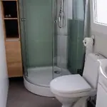 Two Bedroom Mobile Home With Terrace Br1 comprend une salle de bains avec une toilette séparée et une douche. Un sèche-cheveux et des draps de bain sont également fournis.
